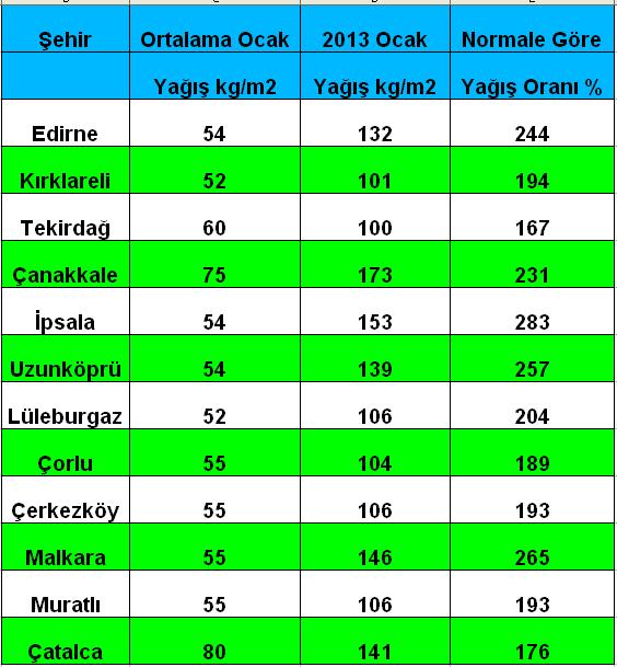 2012’nin son ayında musluğu sonuna kadar açan bulutlar, 2013’ün ilk ayına girerken musluğu kapatmayı unuttular. Zira aralık ayında uzun yıllar ortalamalarının 2-3 katına çıkan yağışlar, ocak ayında da benzer bir performans sergileyerek Trakya’daki birçok merkezde normallerinin iki katına ulaştı. Aşağıdaki tabloda DMİ ve Havatrakya istasyonlarının ocak ayındaki toplam yağış ölçümlerini, uzun yıllar ortalama yağış miktarlarını ve bu seneki yağışların ortalamalara oranını bulabilirsiniz: