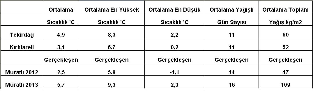2013 Ocak ayı lodos sponsorluğunda ortalamalara göre ılık, geçen seneki dondurucu ocak ayına göre ise fazlasıyla ılık geçti. Aşağıdaki tabloda Havatrakya Muratlı istasyonunda 2012 ve 2013 yılında kaydedilen ocak ayı verileriyle birlikte Tekirdağ ve Kırklareli’nin ocak ayı uzun yıllar sıcaklık ortalamalarını görebilirsiniz: